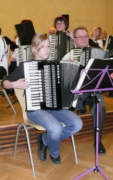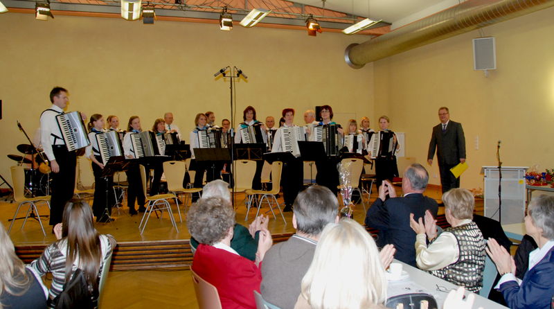| Der Harmonika-Spielring ETTLINGEN e.V. hatte am 14.12.2008 (3. Adventsonntag) im sehr gut besuchten Kasino seine Weihnachtsfeier. Das 1. Orchester unter der Leitung von Bernd Steinbrenner eröffnete das Programm mit dem "Auftritt" vom Ballettabend. 1. Vorsitzender - Bernhard Link - begrüßte die zahlreichen Besucher. Einen ganz besonderen Willkommensgruß galt: Dem Ehrenvorsitzenden Fritz Wandres, den Ehrenmitgliedern Hubert Geyer, Franz Melischko und Klaus Röper jeweils mit Gattin, dem Bezirksvorsitzenden des Deutschen Harmonika-Verbandes - Bezirk Mittelbaden - Manfred Kappler mit Gattin sowie Margret Steinbrenner, die Gattin des Dirigenten. Nach den Stücken "Triumph Marsch" und "Gitanita" standen die Vereins- und Verbandsehrungen an. Bernhard Link konnte Alexandra Utz für 25-jährige Vereinszugehörigkeit mit einer Urkunde und der "Silbernen Vereinsnadel" ehren. Bernhard Kast - 2. Vorsitzender - ehrte Bernhard Link für 40-jährige aktive Vereinszugehörigkeit mit einer Urkunde und der "Goldenen Vereinsnadel". Die Verbandsehrung vom Deutschen Harmonika-Verband - Bezirk Mittelbaden - übernahm der Bezirksvorsitzende Manfred Kappler. Er konnte eine ganz besondere Ehrung für 40-jähriges musikalisches Engagement mit einer Urkunde und der "Verdienstnadel in Silber" an Bernhard Link - 1. Vorsitzender - vornehmen. |