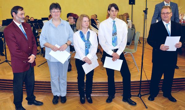 Mit den Stücken "Tango Bolero" und "Air - aus Sinfonia alla Barocco" ging das musikalische Programm weiter. Danach übernahm Manfred Kappler die Ehrungen des Deutschen Harmonika-Verbandes. Er konnte - Annette Pfeifer für ihr 5-jähriges Engagement mit dem "Jugendleiter-Pin in Silber" und einer Urkunde, Markus Link für 15-jähriges musikalisches Engagement mit einer Urkunde und der "Silbernen Ehrennadel", Dominique Boué für 25-jähriges musikalisches Engagement mit einer Urkunde und der "Goldenen Ehrennadel" und Bernd Steinbrenner für 20-jähriges musikalisches Engagement mit einer Urkunde und der "Goldenen Dirigentennadel" - auszeichnen. |