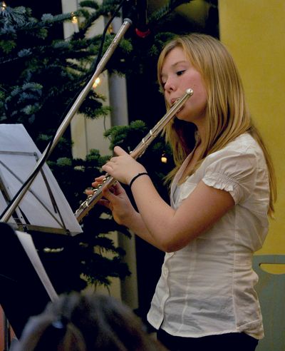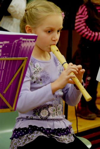 Das 1. Orchester eröffnete nach einer kurzen Umbauphase mit den Stücken "Feliz Navidas und "Weihnachtssterne" den weihnachtlichen 2. Teil. Nach dem gemeinsamen Weihnachtslied "Süßer die Glocken nie klingen" hatten die Spielerinnen und Spieler vom Unterricht, die schon zu Beginn des 2. Teils zusätzlich auf der Bühne Platz genommen hatten ihren Auftritt. Mit den Stücken "Morgen kommt der Weihnachtsmann" und "Alle Jahre wieder" hatten einige zum ersten Mal Bühnenpremiere. Sie wurden begleitet von Christina Fliegauf auf dem Keyboard und Ann-Sophie Reiser auf der Querflöte. |