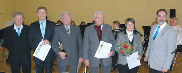 | Für 40-jährige aktive Mitgliedschaft konnte Bernhard Link - Andrea Duschek, Berno Reiser und Bernhard Kast mit einer Urkunde und der "Goldenen Vereinsnadel" ehren. Gleichzeitig wurden die drei geehrten - aktiven Mitglieder - aufgrund ihres 40-jährigen aktiven Musizierens im Verein zu - Ehrenmitgliedern - ernannt. |