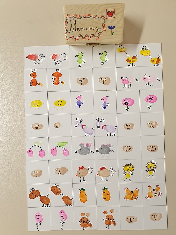 | Der Harmonika-Spielring Ettlingen e.V. konnte in diesem Jahr am 31.7.2021 beim Ettlinger Ferienpass-Programm teilnehmen. Das Motto der Veranstaltung lautete „Memory-Spiel“. Vier Mädchen und drei Jungs nahmen teil. Nach dem Aussuchen der verschiedensten Vorlagen entstanden nach Lust und Laune mit dem eigenen Fingerabdruck die tollsten Tiere und Figuren auf den vorbereiteten Kärtchen. Die Jugendlichen waren mit vollem Eifer und eigenen Kreationen dabei. Zum Schluss gab es eine kleine Schatztruhe zum Verstauen der Memory-Kärtchen. |