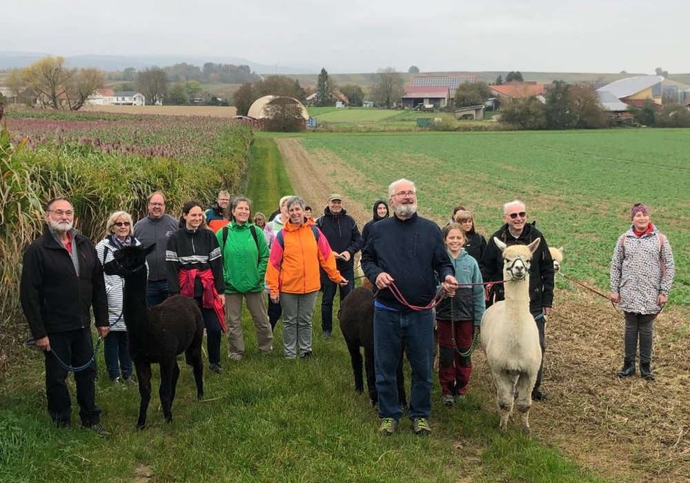 Weiter ging es nach Kapellen-Drusweiler zum Weinhaus der Familie Schowalter. Dort erwartete uns eine einstündige Alpakawanderung. Die sehr ausführliche Einführung von Frau Schowalter zum Umgang mit den Alpakas war aufschlussreich und faszinierend.