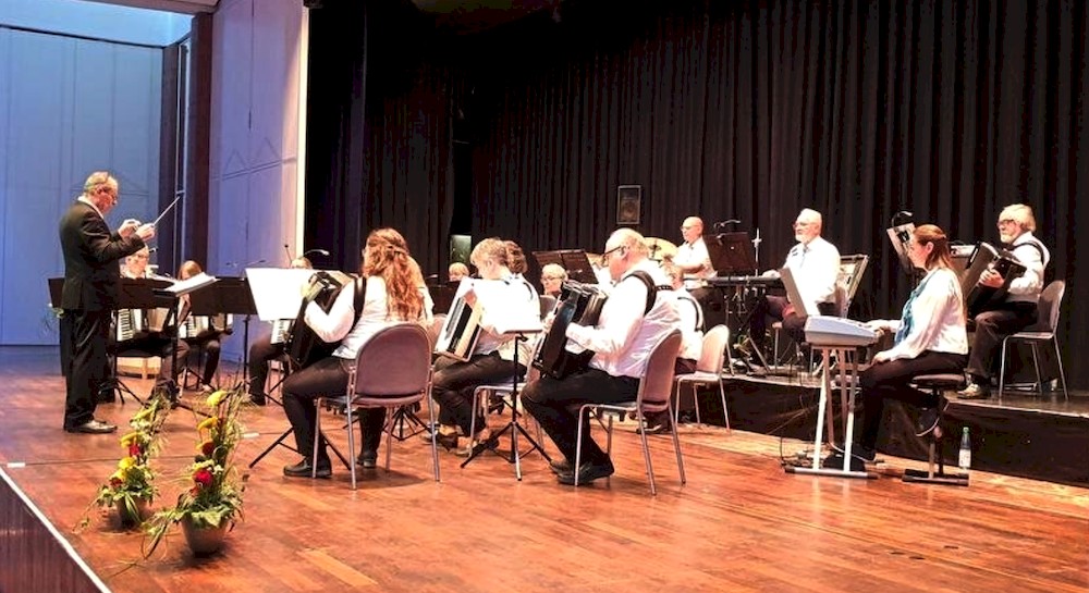Mit den stimmungsvollen Melodien „Summertime“ und „Ol’ Man River“, eingebettet in das Medley „Musical Time“, eröffnete die Akkordeongruppe Steinbrenner, ein kleineres Ensemble, bei dem Bernd Steinbrenner auch selbst Akkordeon spielte, den zweiten Teil des Konzertes.