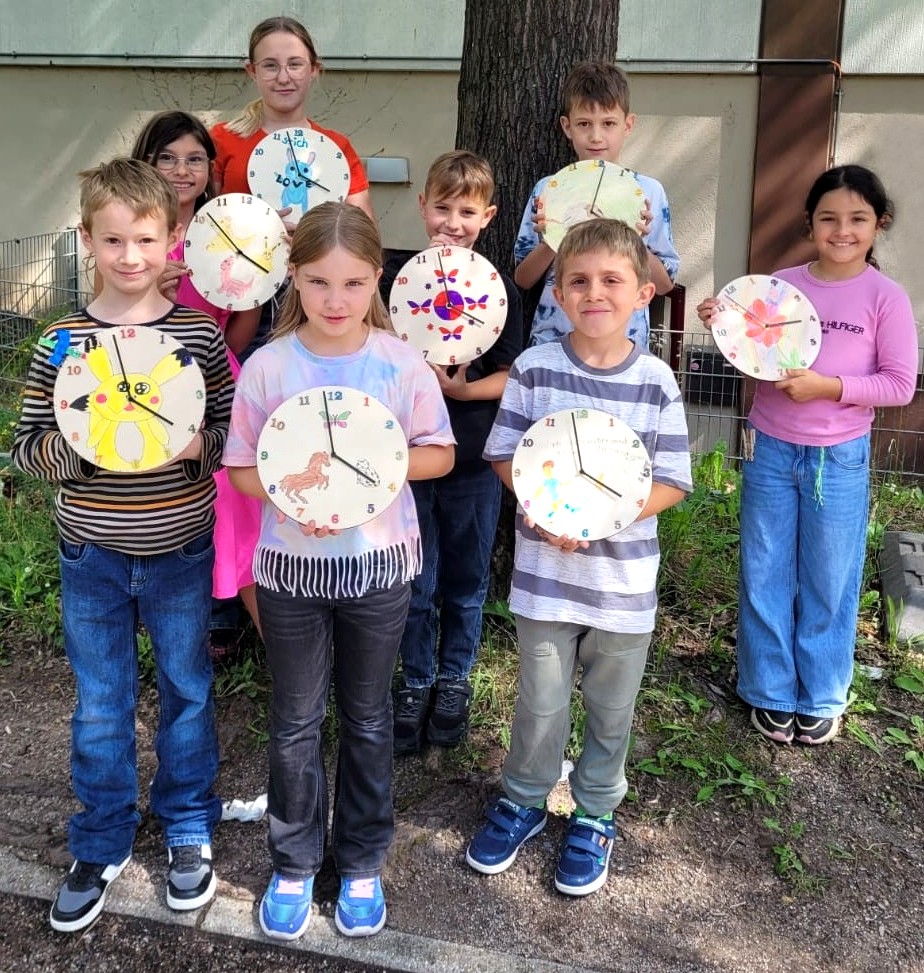 | Der HSE beteiligte sich am 02.08. beim Ettlinger Ferienpass. Das Motto lautete dieses Jahr: „Die Uhrzeit im Blick“. Acht Jugendliche waren tatkräftig und sehr interessiert bei der Arbeit. Nachdem die Holzuhren verteilt wurden und die Ziffereinteilungen in den richtigen Abständen markiert waren, wurden die Ziffern in den verschiedensten Farben angemalt. Danach konnte sich jeder Jugendliche ein Motiv aussuchen oder selbst eines gestalten, das auf das Zifferblatt gemalt wurde. Nach kurzer Trocknungszeit wurden nun die Ziffern anhand der Markierungen aufgeklebt. Jetzt konnte das Uhrwerk montiert werden und alle Uhren tickten zur gleichen Zeit. Jede Uhr war ein Unikat. |