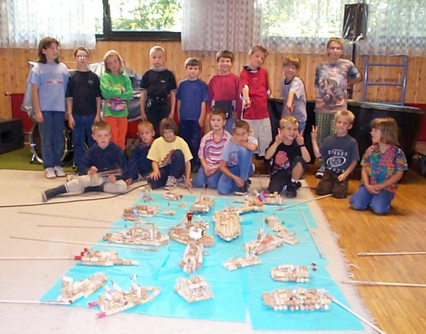 | Am 29. Juli 2000 trafen sich rund 20 Kinder, um im Rahmen des Ettlinger Ferienpasses beim HSE Boote zu basteln. Dabei war der Phantasie der Kinder keine Grenzen gesetzt. Zahnstocher, Korken einfach alles wurde zu den unterschiedlichsten Boote zusammengebaut. Mit Heißkleber wurden die Werke anschließend fest verklebt. Leider musste die Jungfernfahrt auf dem Horbachsee aufgrund der schlechten Wetterlage ausfallen. Dies können die Kinder aber in den kommenden Tagen selbst ausprobieren. Zum Abschluss wurde jedes Boot noch mit einem Stab mit einer Schnur versehen. |