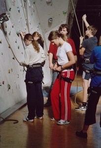 Doch der Tag war noch nicht zu Ende, denn die HSE-Gruppe war von 14 bis 16 Uhr im Kletterzentrum "The Rock" Karlsruhe angemeldet. Der Sicherheitschef "Stefan" gab den Jugendlichen gezielte Anweisungen, wie man sich in der Kletterhalle zu verhalten hat. Nach Anlegung des Sicherheitsgurtes lernten die "Kletterer" den Achterknoten. Die Erwachsenen, die sich bereit erklärten zu "Sichern" bekamen eine besondere Einweisung mit dem "Halbmastwurf-Knoten", danach wurde erst an der Kletterwand die Sicherung geübt. Erst jetzt konnten die Jugendlichen nach Lust und Laune an den verschiedenen Kletterwänden ihre Geschicklichkeit, Kraft und Können unter Beweis stellen. Aber auch diese zwei Stunden vergingen wie im Flug und man musste schon bald wieder die Heimfahrt nach Ettlingen antreten. |