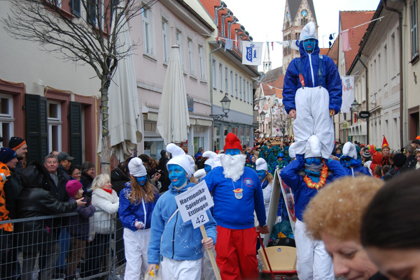 Mit der Zugnummer -42- unter dem Motto "Schlümpfe" zog die närrische Gruppe durch die Ettlinger Straßen.